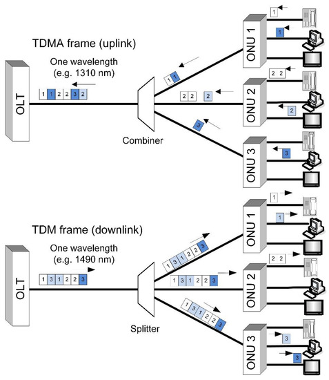 The first PON configurations are based on time-division multiplexing (TDM). In TDM-PONs [10], the passive device operates as splitter in the downstream direction, while it operates as a combiner in the upstream direction. TDM-PONs use one transceiver at the OLT for all ONUs/ONTs, which need synchronization with the operating frequency of the OLT. Each ONU/ONT possesses its own transceiver. New users can readily be added to TDM-PONs. Figure 6 illustrates a typical TDM-PON where the PON operation in the uplink is distinguished from that in the downlink [11]. The PON comprises an OLT and (as an example) three ONUs/ONTs, while different wavelengths are used per traffic flow direction. The ONUs/ONTs buffer the data of their users to be transmitted all together (burst) to the OLT at the assigned time slots in the uplink, as shown in the upper part of Figure 6. Due to the different distances between the OLT and the ONUs/ONTs, the OLT optical receiver must be adapted to different received powers and align the different received phases of the bursts (signals). To accomplish them, the transmission overhead from the ONUs/ONTs increases and thus the throughput decreases. On the other hand, the transmission from the OLT down to the ONUs/ONTs is much easier. As it is shown in the lower part of Figure 6, the same frame arrives to all ONUs/ONTs but each ONU/ONT selectively receives its own data based on an address (ONU/ONT id). The following TDM-PON configurations have been standardized by the International Telecommunication Union–Telecommunication Standardization Sector (ITU-T) [12]: