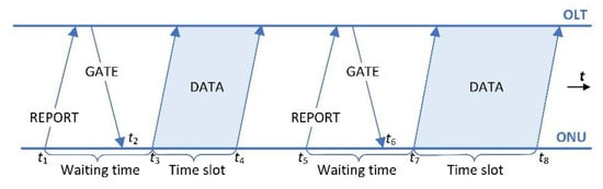 The first implemented DBA algorithm is the IPACT (interleaved polling with adaptive cycle time) [20], where the OLT polls ONUs/ONTs in a round-robin fashion to assign timeslots. After receiving the REPORT messages from all ONUs/ONTs, the OLT calculates the start and end times of each ONU/ONT (timeslot assignment) and sends them with GATE messages (Figure 7). Then, each ONU/ONT schedules the start and end times of packets in its queues. When an ONU/ONT does not have data to transmit, it will send a REPORT message with zero requirements. In this case, the OLT will calculate a timeslot duration equal to the time required to send only the next REPORT message from that ONU/ONT.