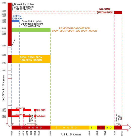 - Ueda, H.; Okada, K.; Ford, B.; Mahony, G.; Hornung, S.; Faulkner, D.; Abiven, J.; Durel, S.; Ballart, R.; Erickson, J. Deployment status and common technical specifications for a B-PON system. IEEE Commun. Mag. 2001, 39, 134–141. [Google Scholar] [CrossRef]