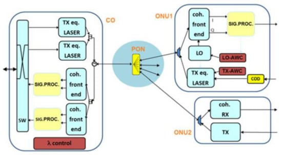 - Kani, J.; van Veen, D. Current TDM-PON Technologies (Standard, Physical Layer, Access Control, Advanced Functions). In Handbook of Optical Networks; Mukherjee, B., Tomkos, I., Tornatore, M., Winzer, P., Zhao, Y., Eds.; Springer: Cham, Switzerland, 2020. [Google Scholar]