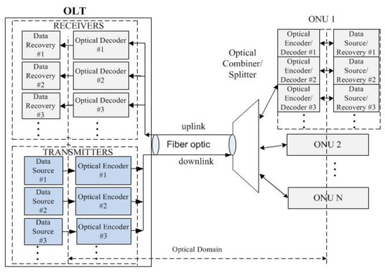 A completely new era of access networks is the optical access network [7]. Their installation should be justified economically, considering the high cost of installing an optical fiber for the user [8]. To this end, the following solutions were adopted: (a) Fiber to the home (FTTH) when the replacement of the existing network seemed necessary, (b) Fiber to the curb (FTTC), or (c) Fiber to the building (FTTB), according to which extent the copper cables should be maintained. Three optical access network architectures were developed [9]: (i) Point-to-point architecture, where the users are connected to the central office (CO) via a dedicated fiber. It has the advantage of a high bandwidth for the user, while the disadvantages are the high cost of installing many FTTH systems and the user’s equipment for the electro-optical signal conversion. Two transceivers per connection are needed (point-to-point). (ii) Active star (point-to-multipoint) architecture, where users are connected to nearby active nodes (hubs) by either copper or fiber cables, or even wirelessly, while the active hub is connected to the CO (and through the CO to the backbone network) by a single optical fiber. The hub comprises one transceiver and is called active just because it needs a power supply. Each user also requires one transceiver. (iii) Passive Optical Network (PON) architecture, like the active star architecture, but the active node is replaced by a passive device, which is a splitter/combiner (depending on the traffic flow direction) or an arrayed waveguide grating (AWG). This is the most popular architecture since the passive device reduces the cost of the entire access network. In PON, the transmission takes place between an optical line terminal (OLT) and the optical network units or terminals (ONUs or ONTs) via the passive device, covering a maximum distance of 50 km with a speed in the order of Gb/s. The OLT belongs to the CO, while the ONU/ONT are located in the user area (ONU at the edge of FTTC or FTTB, while ONT at the edge of FTTH). Communication between PON users is possible only via the OLT.