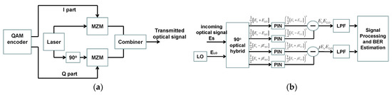 - Sano, A.; Kobayashi, T.; Ishihara, K.; Masuda, H.; Yamamoto, S.; Mori, K.; Yamazaki, E.; Yoshida, E.; Miyamoto, Y.; Yamada, T.; et al. 240-Gb/s polarization-multiplexed 64-QAM modulation and blind detection using PLC-LN hybrid integrated modulator and digital coherent receiver. In Proceedings of the European Conference on Optical Communication, Vienna, Austria, 20–24 September 2009; Volume 2009 (Suppl. 1), p. 2. [Google Scholar]