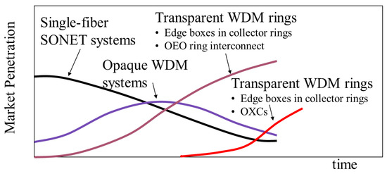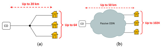 In the 1990s, although backbone networks could provide high-capacity links based on SONET/SDH systems (over 10 Gb/s), access networks were the limiting factor for the provision of broadband services to users, e.g., video on-demand, interactive/video games and video conferencing. Access networks, such as DSL, could provide relatively low bandwidth, especially in the upstream direction (in the order of a few hundred kb/s). Moreover, even if some versions of DSL could provide a higher bandwidth (50 Mb/s) in the downstream direction, the access distance is short enough (up to 6 km, or, in the case of 50 Mb/s, significantly less) [5]. It is worth mentioning that DOCSIS systems used by cable television operators provided not only cable television (CATV—Community Antenna Television) but also internet access over the existing infrastructure of HFC, covering a much longer distance (up to 160 km) and offering a broadband access (up to 1 Gb/s in the downstream direction). However, since these systems have been designed for broadcasting, their use as access networks by allocating bandwidth to users according to demands, it is not the most proper solution for broadband access. Nevertheless, HFC showed that troubleshooting existing access networks could be accomplished by the extensive use of fiber optics, which offer ample bandwidth with very low losses [6].