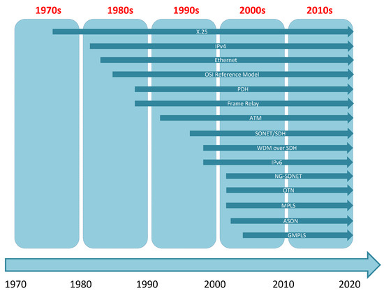 The F1G era is dedicated mainly to telephony and fax, which required 64 kb/s data rates and latency of tens of ms. Generic internet browsing also became possible mainly at the end of this era, as significant technological achievements such as IPv4, Ethernet and the OSI reference model were standardized during the 1980s. At first, access to the PSTN infrastructure, along with the use of a modem, allowed the essential elements to connect to the Internet. Later, the introduction of the Integrated Services Digital Network (ISDN) standard, depending on its narrowband or broadband variant, increased the overall data rate, decreasing in this way the overall user’s downloading time.