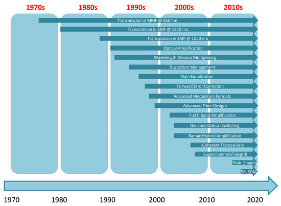 - Winzer, P.J.; Neilson, D.T.; Chraplyvy, A.R. Fiber-optic transmission and networking: The previous 20 and the next 20 years [Invited]. Opt. Express 2018, 26, 24190–24239. [Google Scholar] [CrossRef]