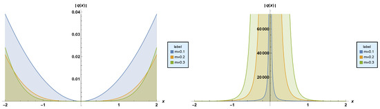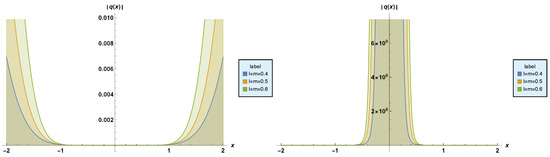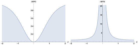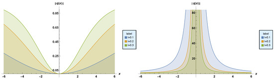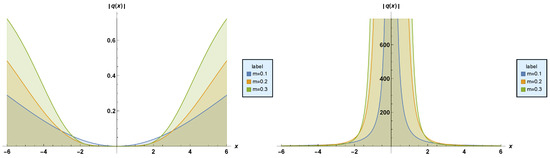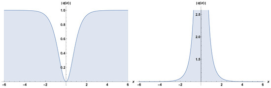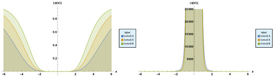 Figure 7. Profiles of stationary dark and singular solitons, respectively. - Result–2:Substituting (58) along with (8) into (53) provides us with the straddled solitonSetting and condenses (59) to dark and singular solitonsandFigure 8 depicts the plots of dark and singular solitons (60) and (61), respectively. The parameter values chosen are: , and .