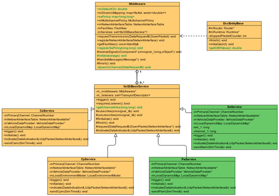 SaService and PaService were created to simulate SAM and PAM message types. Both were implemented according to CaService. In SaService, the basic channel information was stored statically. A new function was created to register advertisement information to the corresponding Middleware in the base class of all the service classes. When a SAM message is transmitted, in the indicate function of the SaService, the SAM is parsed, and the advertisement information can be registered to the Middleware. Figure 1 shows the simplified structure of the abovementioned components of Artery. The green parts present newly created modules and functions.