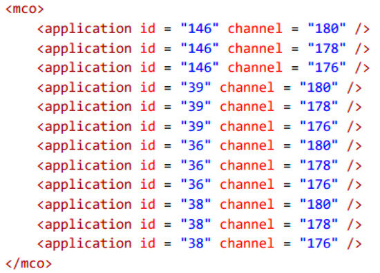 First, the MCO Policy XML file (mcoPolicy.xml) needs to be configured by specifying the Application ID (AID) of the applications we want to use and then the corresponding channel (Figure 2). Multiple channels can be assigned to a single AID, which allows the applications to switch channels at runtime because, from this file, they know they could use another channel as an alternative. After processing the XML file, the ID-channel number pairs are saved in the Middleware.