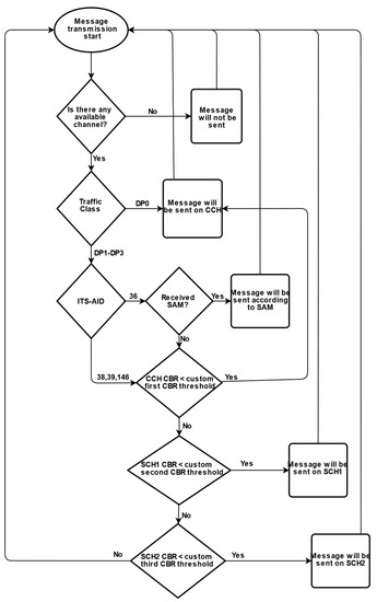 Since both CAM and CPM have a DP2 profile, further distinctions are used. If the message profile to be sent is DP2 (DP1-DP3), we also look at the message type. If it is a CAM (AID = 36), then the CBR values for the CAM defined in channelChange.xml will be the thresholds. If it is a CPM (AID = 146), the CBR values will be related to the CPM. Using this method, different CBR values for different message types can be set. If we want a message to stay longer with a higher-priority channel, we need to specify higher CBR threshold values. When the ITS-AID is 36, another distinction is used, namely the Service Announcement Service (SAS). This means that vehicles can get SAMs with channel information regarding which channel will be the next CAM in the queue transmitted. For the sake of simplicity, it was implemented only for CAM. The complete algorithm is depicted in (Figure 4).