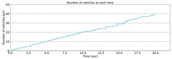 A 500 ms vehicle generation interval was used in the simulations to introduce road users to the grid. This means that, until the end of the simulation time, SUMO will generate about two cars per second and launch them on a randomly chosen route. Thus, SUMO produced 40 vehicles till the end of the considered 20 s simulation scenario (Figure 6).