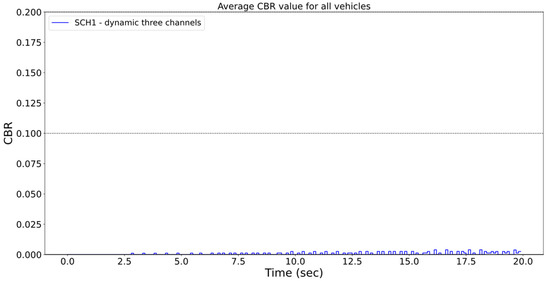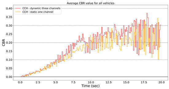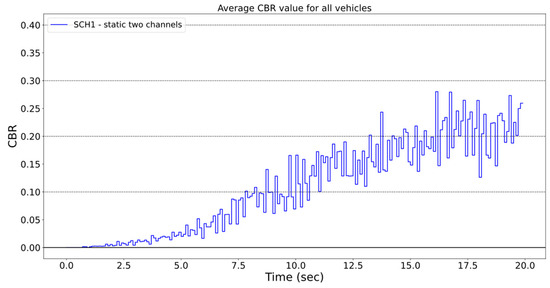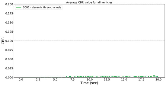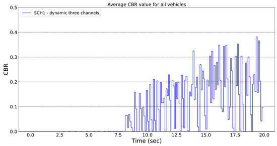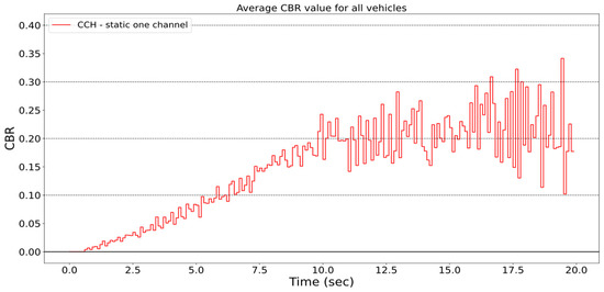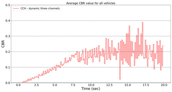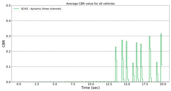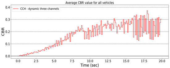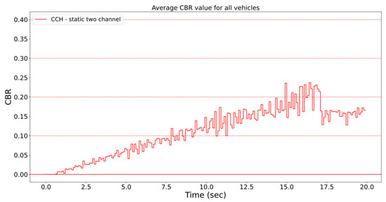 In this situation, the CBR of the CCH channel increases until the 16th second; after that, it decreases slightly due to DCC (Figure 8). The highest value was 0.23 and a little above 0.15 towards the end of the simulation. It is clearly visible that the CBR value is much lower in this case compared to the situation where all application data were transmitted on one channel.