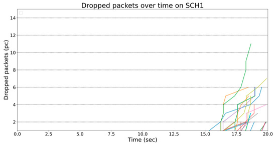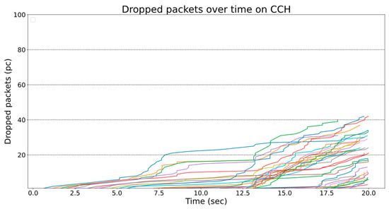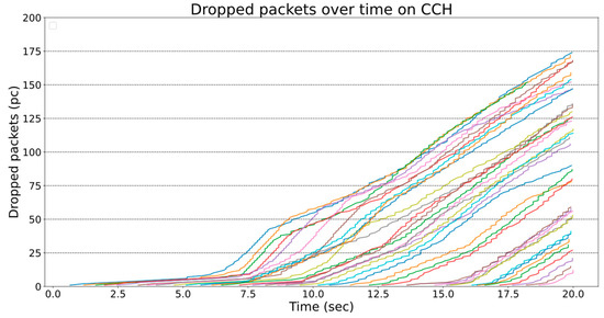 On the SCH1 (Figure 20), packet drops can only be observed after 15 s. This is because, at the beginning of the simulation, messages are transmitted on CCH, and the congestion rate of the SCH1 is only considerable towards the end of the simulation. The number of dropped messages is even lower than CCH.