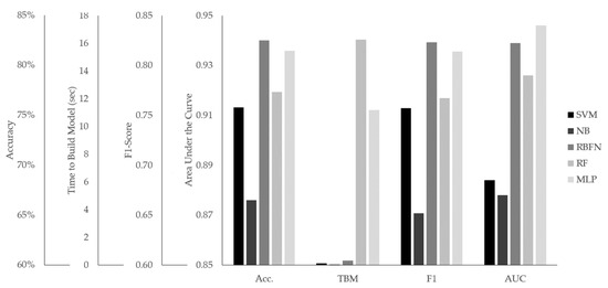 The best results of each of SVM, NB, RBFN, RF, and MLP models, in terms of accuracy, time to build model (in s), F1 score, and area under the ROC curve.