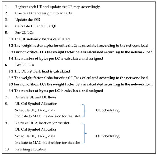 A weight factor, denoted as “alpha” is introduced, which is defined concerning the network load and is used to provide more resources per service, compared to what is requested, for critical services (e.g., ToD, HDM). Similarly, a weight factor “beta”, related to the overall network load is used to allocate fewer resources in the case of non-critical BSM services. When both factors are set, the number of bytes per LC is calculated and assigned. Steps 7–10 of the implementation follow the PF scheduler design [23].