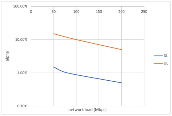 The weight factor alpha is expressed as a percentage of the network load and its adaptation according to the network load in the UL and DL sessions can be found in Figure 2. The values selected for this factor have been the result of extensive simulations. For instance, in the UL for an overall network load of 200 Mbps the alpha factor is 5% and in the DL for the same load, the alpha is 0.5%. For the case of a modest network load of 50 Mbps the alpha factor is set at 15% for the UL and 1.5% for the DL. The relation between the alpha factor and the network load can be approximated and expressed as an exponential equation: for the UL and for the DL.