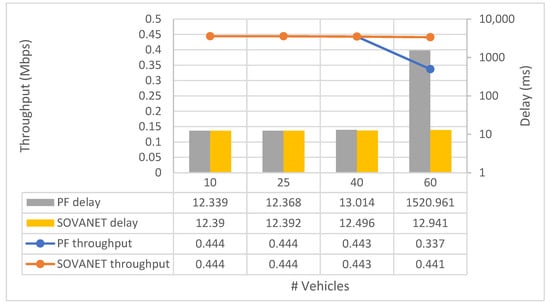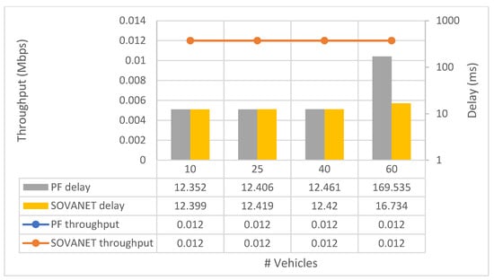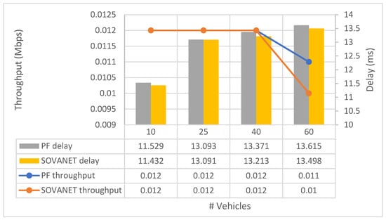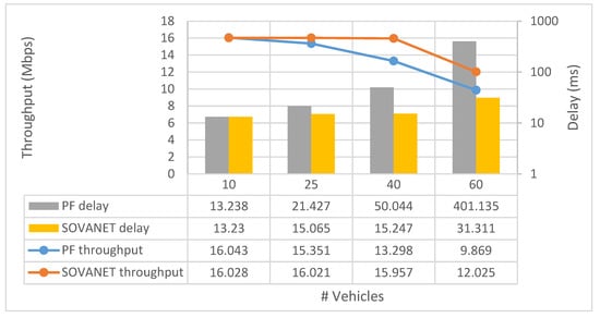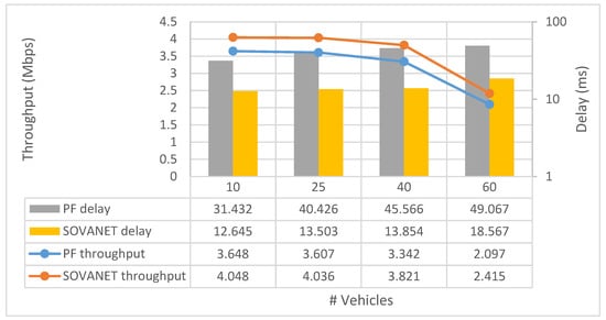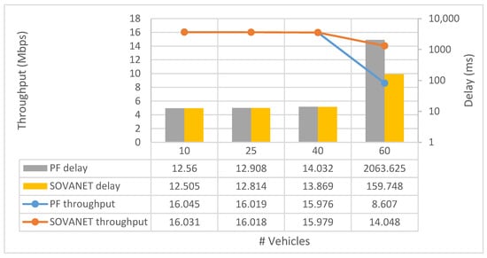 In the results presented in Figure 6 regarding the HDM DL, both schedulers’ performance is similar for the first three cases. In the fourth and most demanding scenario, a considerable degradation of 63.2% in the throughput and a 1191% delay increase for the PF scheduler were recorded. Still, although SOVANET outperforms the PF scheduler, in the case of 60 vehicles, the SOVANET also illustrates a severe performance degradation in terms of delay.