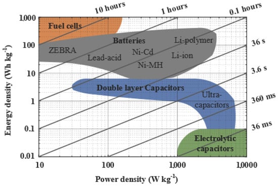 UAVs can be classified based on their power source [15]. Different types of UAVs are used for different applications, and there is a suitable power source for each application. Some options include fuel cells, combustion engines, batteries of various technologies, and more. These power sources are crucial for the operation of UAVs and must meet certain requirements such as size, weight, cost, and power density. Power density is the amount of energy contained in a power source, measured as energy per unit weight, typically in Joules per cubic meter (J/m) or watts per cubic meter (W/m, ). One way to evaluate power sources is through the Ragone diagram of a supercapacitor [41], which can have high specific power but low specific energy (Wh/kg), which limits its ability to operate for extended periods.