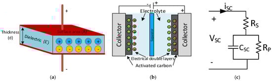 (a) Structure of electrostatic capacitor, (b) structure of SC, (c) equivalent circuit model of SC [56].