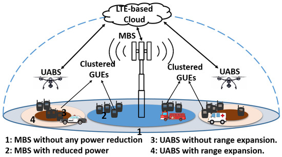 An illustration of a PSC scenario with fixed MBS, mobile UABSs, and clustered GUEs constitute the air–ground HetNet infrastructure. The MBS can use various inter-cell interference coordination techniques defined in LTE-Advanced. The UABSs can utilize range expansion bias to offload GUEs from MBS.