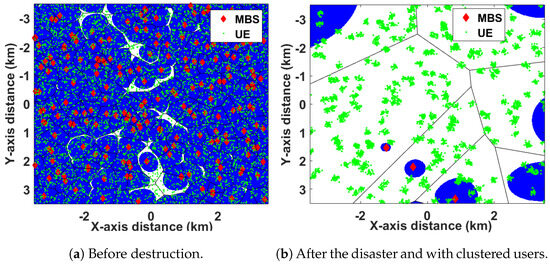 For the proposed AG-HetNet, UABSs are initially deployed on fixed hexagonal locations within the simulation area () as shown in Figure 6. In Figure 6a, we illustrate the UABSs’ deployment on the fixed hexagonal location when 50% of the MBSs are destroyed, and in Figure 6b, when 95% of the MBSs are destroyed. Each UABS sends its 2D location coordinates and the system-level resources allocation for a GUE to an edge server, and using the brute-force algorithm described in Algorithm 1, the two KPIs of the AG-HetNet will be determined at the edge server. The global maxima values of the best state () of all the possible states can be vectorized into .