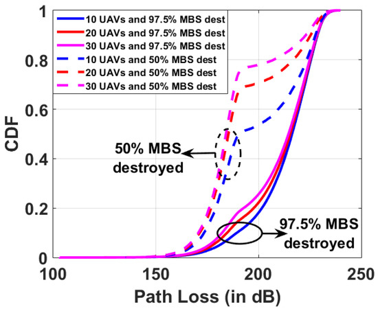 Figure 3 characterizes the empirical path loss cumulative distribution functions (CDFs) for the OHPL model, calculated for all distances between the base stations ( and the ) and GUEs () that are distributed using MCP and TCP. By inspecting Figure 3, we can intuitively conclude that the maximum allowable path loss is diverse when the GUEs are distributed using MCP and TCP. In Figure 3, we plot the CDFs for the cases when and of the MBS are destroyed. A close inspection of Figure 3 reveals that the variation in CDFs is minimum for the different numbers of UABSs deployed and for a different number of the MBSs destroyed. Both MCP and TCP observe a similar distribution in CDF, and the maximum allowable path loss for the system when the GUEs are distributed using both processes is approximately 240 dB.