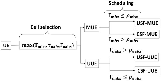 The process of cell selection uses the SIR definition given in Table 3 for each base-stations of interest (MOI and UOI) and the positive-biased CRE at UABSs. The positive-biased CRE at UABSs is applied to increase the SIR coverage. Consequently, during a cell selection, the GUE always prefers camping on base stations of interest (i.e., MOI or UOI), which guarantees the most suitable SIR. After cell selection, an MBS-GUE (MUE) and UABS-GUE (UUE) would be scheduled in either USF or CSF radio subframes based on the scheduling threshold of at UABS and ) at MBS. This strategy of cell selection and GUE scheduling in USF or CSF subframes of base stations of interest (MOI or UOI) is similar to that of [4,5] and is summarized in Figure 5.