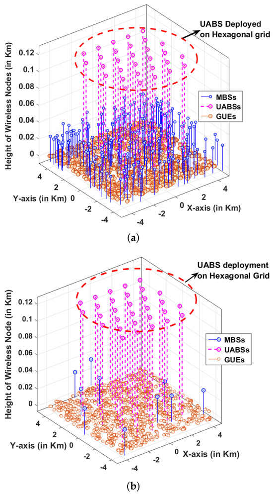 To simulate the public safety scenario, a two-tier AG-HetNet is modeled, with 3D locations of MBS and UABS captured in matrices and , respectively, with and denoting the number of MBSs and UABSs within the simulation area (). Similarly, the 3D distribution of GUEs is captured in matrices with a density of and modeled using the Matérn cluster process (MCP) and Thomas cluster process (TCP). Wherein MCP and TCP are the special cases of the Neyman–Scott process [37],