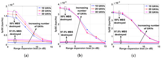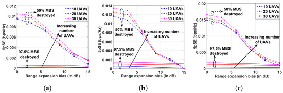 For a varied number of UABS deployed in the AG-HetNet, we plot the 5pSE variation for a positive bias CRE as seen in Figure 8a–c. When of the MBSs are destroyed, the peak values in the case of the no-ICIC mechanism (NIM), eICIC, and FeICIC observed lower values of CREs. Moreover, as the CRE increases, the number of GUEs associated with the UABSs increases, and so does the interference experienced by these GUEs, thus decreasing the overall 5pSE. In a high disaster-struck scenario, when of the MBSs are destroyed, a relatively slow degradation of peak values of 5pSE is observed with the increasing CRE for NIM, eICIC, and FeICIC techniques.