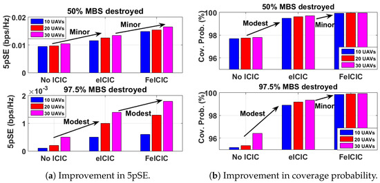 From the simulation results given in Figure 9 and Figure 12, we observe reduced power FeICIC in Release-11, which is observed to outperform Release-10 eICIC and without any ICIC, in terms of the overall 5pSE and coverage probability of the AG-HetNet. Further inspection reveals that the peak values of 5pSE and coverage probability are observed when fewer MBSs are destroyed. Also, the 5pSE and coverage probability is higher when more UABSs are deployed.