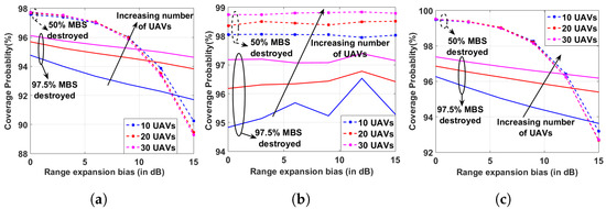 Similarly, we discuss the coverage probability variation for positive-biased CRE. The results in Figure 12a–c demonstrate that when of the MBSs are destroyed, the peak values in the case of NIM, eICIC, and FeICIC are observed for the moderate values of CREs. Moreover, as the CRE increases, the number of GUEs associated with the UABSs increases, and so does the interference experienced by these GUEs, thus decreasing the overall 5pSE. Whereas in a high disaster-struck scenario with of the MBSs destroyed, the peak value of 5pSE for NIM is observed in the range of 0–3 dB CRE, the eICIC technique observes a peak value around 12 dB CRE, and FeICIC is observed in the range of 0–3 dB CRE.