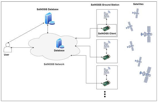 Figure 2 shows the high-level relationships between users, the SatNOGS network, the SatNOGS database, GSs, the SatNOGS client, and the satellites. Bidirectional arrows in Figure 2 represent bidirectional data flow. For example, between the SatNOGS network and the SatNOGS client, installed in this case on a Raspberry Pi, parameters will be sent from the network to the client so that the GS is configured to receive telemetry data. In the opposite direction, that is, from the client to the network, this data will be uploaded. Compared to the SatNOGS database, in the database located within the network, other information is stored, such as future observations and all GSs and their parameters (e.g., location, ID, and frequency range). If one wants to collect or access any information, one can do so through the SatNOGS network [14], SatNOGS DB [15] SatNOGS DB API [11], or SatNOGS network API [10] depending on the data one wants.