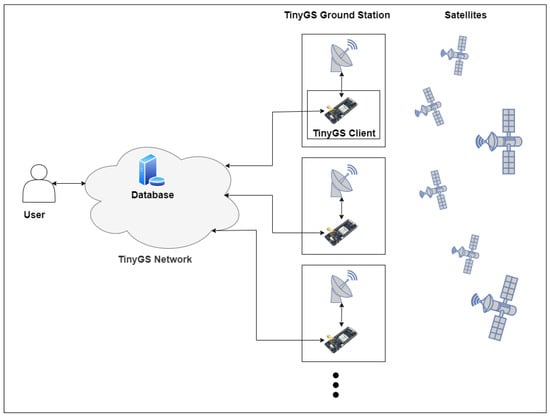 Figure 4 shows the high-level relationships between users, the TinyGS network, GS, and satellites. Contrary to SatNOGS, in TinyGS, the information about satellites, GS, and observations is contained in the same database. If one wants to collect or access any information, one can do so through the web application [23], Telegram, or the programmatic API (if one owns a GS), depending on the information one wants.