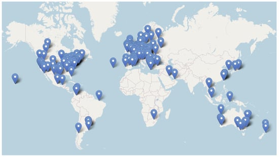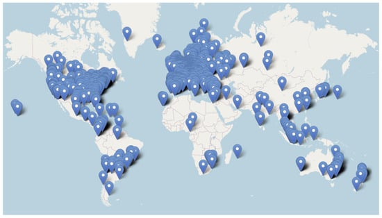 During the article’s development, all TinyGS data including GS details and satellite information were collected from TinyGS’s web application [23]. However, for SatNOGS, the GSs’ details were obtained from the SatNOGS network API [10], and the satellite details were retrieved from the SatNOGS DB API [11]. GS data encompassed their coordinates ([latitude, longitude]), frequency ranges, creation date, and the last time that GS was online (only for SatNOGS), while satellite data covered operational status, downlink frequency, and the number of data received and decoded by GSs from that specific satellite. The data concerning the last time the GS (ground station) was online (e.g., 5 October 2022 12:49:26) were crucial to determining whether the SatNOGS GSs were online within the last 24 h on 29 July 2023, and consequently, were used to carry out Topics 6, 7, and 8 mentioned in the Methodology section. In TinyGS, these data were not needed because, at the time of writing (August 2023), all the GSs listed in the TinyGS web application were online within the last 24 h. Coordinates (e.g., [38.0169, 23.731] in degrees) and the frequency range of the GSs (e.g., [400, 460] MHz) were used exclusively in Topics 7 and 8, respectively, to observe the geographical distribution and frequency bands. The last piece of data regarding GSs, the creation date (e.g., 22 July 2015), was used in Topic 14 to observe the number of GSs from corresponding projects over time. Regarding satellites, the operational status aims to indicate whether a satellite is on the network satellite list so that the network can configure GSs to observe and receive data from that satellite. This variable takes only two values, “True” or “False”, and was used in Topics 9, 10, 11, and 12. In turn, the numbers of data packets received and decoded by GSs from particular satellites are integers (e.g., 925,348 and 827,571, respectively) and were used in Topics 9, 10, 11, 12, and 13. Finally, the downlink frequency of satellites, also referred to as the satellite frequency (the frequency at which the satellite is transmitting the signal and the ground station is receiving it, for example, 436.703 MHz), was used and rounded to whole units in Topics 10 and 12 for histogram creation. It is important to note that some satellites had more than one downlink frequency, for example, they could transmit signals at frequencies of 868.100 MHz and 2422.000 MHz, and in that case, both frequencies were considered.