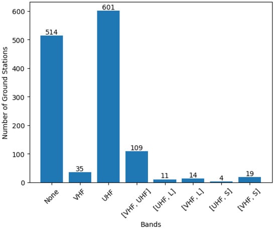 In Topic 6, the number of GSs online in the last 24 h on 29 July was compared between both projects. At the time of writing, the TinyGS web application only displays the GSs that were online in the last 24 h, so all GSs in that web application were selected. In SatNOGS, the “status” parameter of various GSs was observed as well as the last time online for GSs that were offline, and only online GSs and those offline in the last 24 h were selected. Topic 7 compared the geographical distribution of the GSs from the previous section based on their coordinates (latitude and longitude). Topic 8 originally intended to compare the frequency ranges of different GSs mentioned in the last two sections of each project. However, due to the multitude of varied frequency ranges, representing them in a histogram became impractical. Instead of focusing on frequency ranges, the analysis shifted to comparing the bands used by these GSs in both projects, such as UHF. This approach enables satellite developers interested in utilizing these GS networks to identify the bands with the highest number of GSs. Consequently, they can make informed decisions about which bands to utilize for their specific needs.
