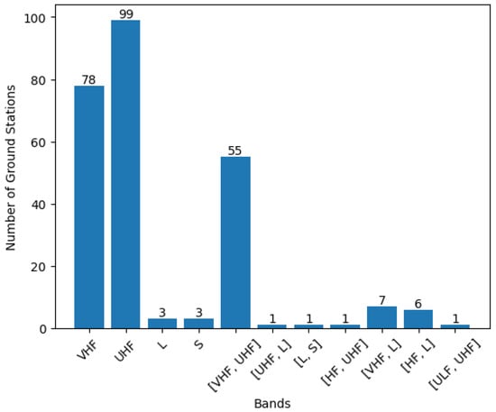 Regarding Figure 11, it is possible to observe that most of the satellites, about 60%, work with frequencies between 400 and 450 MHz, as in TinyGS. Furthermore, about 80% of the satellites work with frequencies between 100 and 149 MHz, 400–449 MHz and 2200–2249 MHz.