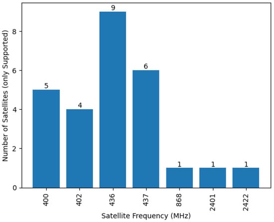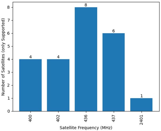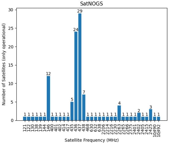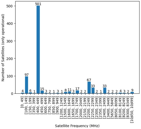 To create Figure 11, the first step involved accessing all satellites and examining their transmitters. Each transmitter has various parameters, including the downlink frequency, which characterizes the frequency at which the satellite transmits the signal and the saved frequency. However, some satellites have multiple transmitters, and in such cases, downlink frequencies were kept without repetitions. For instance, if a satellite had three transmitters with the same downlink frequency (146 MHz), even if they used different downlink modes (BPSK, USB), the 146 MHz frequency was saved only once and not three times. Furthermore, only the downlink frequencies of transmitters with “alive” set to “True” [11] were saved, meaning malfunctioning transmitters with “alive” set to “False” were not considered. It is important to note that among the operational satellites, 37 either lacked transmitters in the database or possessed only inactive transmitters (e.g., were malfunctioning), and therefore, these satellites do not appear in this histogram.