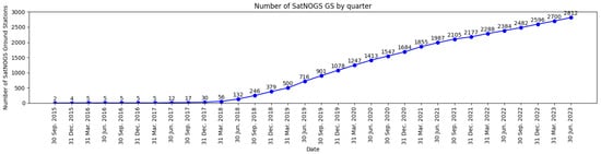 In Figure 14, a quarterly study is presented where it is possible to observe the number of SatNOGS GSs created from 30 September 2015 to 30 June 2023. As one can see, from the last quarter of 2018, the graph has an approximately linear behavior.