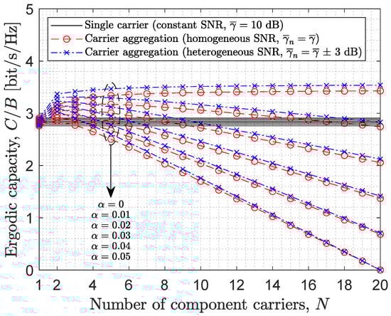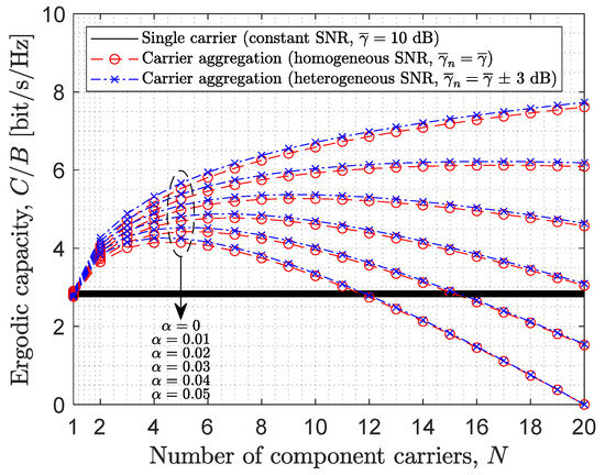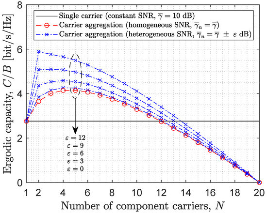 Figure 2 shows the ergodic capacity of CA (in terms of the spectral efficiency, i.e., bit/s/Hz) as a function of the number of CCs for various values of the bandwidth overhead parameter . The capacity obtained for single-carrier transmission (i.e., ) is plotted as a horizontal solid black line along the width of the figure to provide a reference threshold that determines the range of CCs for which the considered CA-based transmission scheme outperforms the benchmark (i.e., the case of single-carrier transmission). Note that this threshold is different for each case plotted in this figure and, as is the case in this figure and other figures that will be shown later on, the reference lines may be very close to each other. The first relevant observation is that these results corroborate that CA can be effectively employed as a diversity technique to increase the data rate of the system without increasing the available bandwidth, which can be confirmed by noting that the curves for CA can lead to a higher spectral efficiency than the single carrier scenario (in certain regions of the figure if the number of CCs is correctly configured, which will be discussed later on). It can also be noted that the performance of CA tends to be slightly higher in the heterogeneous SNR scenario than in the homogeneous counterpart. This can be explained by the fact that the level of frequency diversity in the heterogeneous scenario is higher and in such a case the proposed method, based on the use of CA as a diversity technique, can benefit from it to a greater extent. The bandwidth overhead parameter is also observed to have a significant impact on the resulting performance. As expected, if the use of CA incurs a higher bandwidth penalty (i.e., higher value of ), a lower amount of net bandwidth is available for data transmission, which leads to lower data rates. Note that in the hypothetical case of (i.e., if no bandwidth penalty is incurred by using CA), then the capacity would monotonically increase indefinitely with the number of CCs, as this would increase the frequency diversity gain without any bandwidth penalties. However, in a realistic case with , the curves in Figure 2 become convex. This indicates the existence of an optimum number of CCs that maximises the data rate for each value of . As explained in Section 3, increasing the number of CCs will initially increase the data rate as a result of increasing the frequency diversity in the system. However, this also increases the total amount of signalling traffic and bandwidth reserved for guard bands (i.e., bandwidth penalty), which reduces the total amount of bandwidth available for data transmission and contributes to reducing the data rate. If the number of CCs is sufficiently high, the bandwidth penalty incurred by a high number of CCs will exceed the gain obtained from the frequency diversity, thus effectively reducing the data rate. In fact, if the number of CCs is made arbitrarily large, it can be seen in Figure 2 that the data rate of CA can indeed fall below that of the single carrier scenario, and this will occur sooner (i.e., for a lower number of CCs) when the bandwidth penalty is higher. In the extreme case where the number of CCs is set equal to (e.g., see the case = 0.05 and N = 20), then all the available bandwidth is employed to accommodate signalling traffic and guard bands, which effectively reduces the total capacity available for data transmission to zero. The optimum number of CCs, thus, depends on the bandwidth penalty parameter. From Figure 2 it can be determined that the optimum number of CCs that maximises the data rate for is 16, 9, 7, 5 and 4, respectively, which is in line with the observations above.