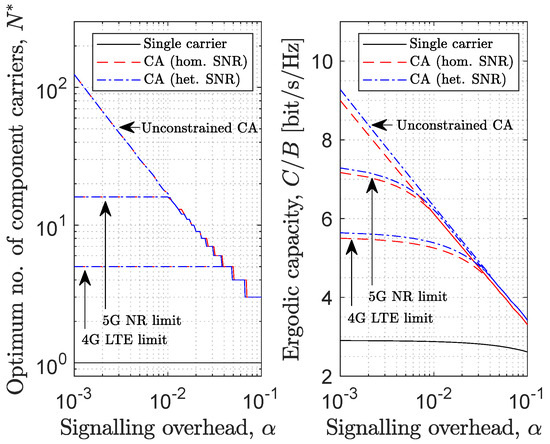 When CA is employed, each CC runs its own instance of the MAC and PHY layers and their associated processes, which are dynamically adapted to the instantaneous channel quality conditions experienced in each CC. This requires the use of L1/L2 control signalling to exchange control and feedback information for each CC. The signalling overhead introduced by each CC together with the guard bands required between adjacent CCs can both be jointly characterised by a fraction () of the total bandwidth. As a result, a bandwidth needs to be sacrificed for each employed CC and the total bandwidth W available for data transmission when N CCs are used is . Note that the overhead parameter refers to the fraction of total available bandwidth B and not to the bandwidth allocated to each individual CC. In order to obtain a positive data rate, the requirement must be met, which implies that the number of CCs that can be used is constrained by the upper bound .