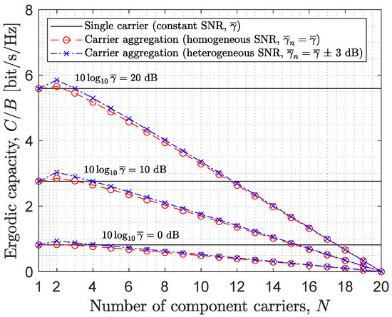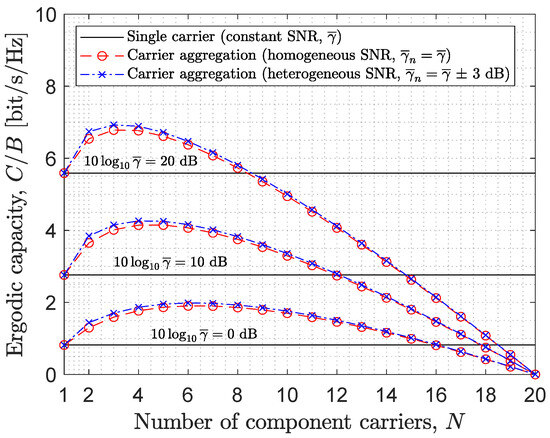 As discussed in Section 4, two frequency diversity scenarios are considered, namely, a homogeneous SNR scenario, where all CCs experience the same average SNR ( for ), and a heterogeneous SNR scenario, where each CC experiences a different average SNR ( for ), with an overall average SNR . In the heterogeneous SNR scenario, the average SNR of each individual CC is selected from the interval , where (in dB) is a spread parameter that determines the level of potential frequency diversity (the larger the value of , the higher the level of diversity in the propagation scenario). For simplicity, the performance is mainly investigated for the ideal model of effective SNR. The numerical results obtained for such a model show more pronounced trends that illustrate more clearly the impact of different relevant parameters. Some examples illustrating the impact of considering the average model of effective SNR are also shown, corroborating that the same trends are observed (just with different numerical values) and the same conclusions are therefore obtained. For convenience, all the capacity performance results presented in this section are given in terms of the ratio , which represents the capacity per unit bandwidth (in bit/s/Hz), and therefore, does not require the consideration of a specific channel bandwidth for numerical evaluation.