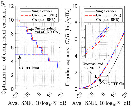 Figure 4 shows the ergodic capacity of CA as a function of the number of CCs for various values of the average SNR experienced in the different considered scenarios. As expected, the capacity performance improves when the SNR increases and degrades when the SNR decreases, thus indicating that the dependency on the SNR is adequately captured. This figure also corroborates the main observations made when discussing Figure 2, namely, that (i) CA can be effectively employed as a diversity technique in order to improve the spectral efficiency with respect to the traditional single carrier scenario based on the same communication bandwidth (provided that the number of CCs is correctly configured); (ii) the performance of CA as a diversity technique tends to increase in the heterogeneous SNR scenario compared to the homogeneous SNR counterpart as a result of a richer diversity; and (iii) there exists an optimum number of CCs that maximises the total capacity, in this case, for each considered average SNR, for the same reasons discussed for Figure 2. Regarding the last observation, it can be seen in Figure 4 that the optimum number of CCs decreases as the average SNR increases. More concretely, for the numerical example shown in Figure 4, the data rate is maximised with 6, 4, and 3 CCs when the average SNR is 0, 10, and 20 dB, respectively. This trend can be explained intuitively based on the fact that a higher average SNR can be associated with a shorter communication distance, where the level of diversity can be expected to be lower than in a longer distance link (where the signal can find a larger number of diverse paths between the transmitter and receiver). Thus, a lower diversity gain means that a lower number of CCs can be used while guaranteeing that the bandwidth penalty associated with the number of CCs does not exceed the diversity gain. The optimum number of CCs as a function of the average SNR for a broader range of average SNR values is illustrated in Figure 5 along with the capacity obtained when the optimum number of CCs is used for every average SNR. This figure shows clearly how the use of CA as a diversity technique can significantly improve the spectral efficiency in order to increase the system capacity without increasing the amount of spectrum employed. Taking an average SNR of 10 dB as a reference, the results in Figure 5 indicate that the spectral efficiency of 2.74 bit/s/Hz in the single carrier scenario can be improved to around 4 bit/s/Hz with the use of CA as a diversity technique (in all cases, namely, 4G LTE, 5G NR and unconstrained CA), which represents a 55% increase in the system capacity without increasing the available bandwidth.