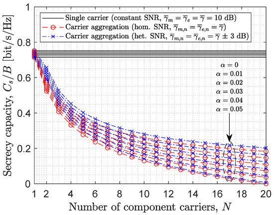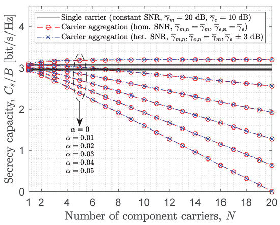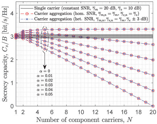 The instantaneous secrecy capacity of a wiretap channel [38] is defined as the difference between the instantaneous channel capacity for the legitimate receiver (i.e., the intended recipient) and the instantaneous channel capacity for the eavesdropper (i.e., the potential attacker). Mathematically, it is defined as if and zero otherwise, where and represent the instantaneous SNR of the main and eavesdropper links, respectively, and their instantaneous capacities are given by and , respectively. Note that the eavesdropper needs to use the same configuration as the main link in order to attempt to successfully decode its information. If the main link transmits over a bandwidth B using CA with N CCs, then the eavesdropper must do exactly the same. As a result, the bandwidth penalty parameter will be the same for both links as will the net bandwidth available for data transmission, hence the presence of the same bandwidth W in the expressions of both and .