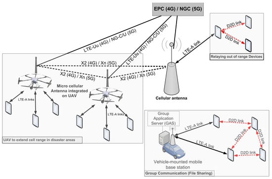 Instead of using UAVs, the author in [8] proposes the deployment of a vehicle-mounted mobile base station to provide services like file distribution among group communications over heterogeneous architecture with the aid of a group Application Server and Proximity Service links, as illustrated in Figure 1. In this solution, a vehicle-mounted mobile base station is placed close to the disaster area and works in a cell-breathing manner to expand or shrink the cell coverage periodically to support group communications. Even though the proposed solutions can provide effective support to extend/minimize the overload of the cellular network, the deployment of land and air vehicles is limited to accessible disaster areas, and their commissioning may take additional delay not usually suited for emergency situations.
