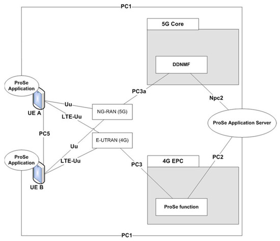 The architecture presented in Figure 2 shows a basic case of two UEs belonging to the same public land mobile network (PLMN) supporting 4G and 5G networks. However, it is possible that UEs register to different PLMNs or even belong to different radio access networks (RANs) such as LTE-A and WiFi. Some other interfaces not mentioned in this paper can be used for roaming scenarios to keep the home ProSe function/DDNFM reachable for both the roaming UE as well as the visiting ProSe function.