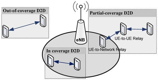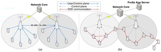 On the other hand, in the last few years, the Third Generation Partnership Project (3GPP) has introduced device-to-device (D2D) technology [1,2], which enables a direct connection where the data plane can be handled by User Equipment (UE) without crossing the cellular network infrastructure. This D2D technology can be coupled with a Proximity-based Service (ProSe) [3] that provides many functions, including discovery, communication, and the relay mode. ProSe technology allows UE in proximity to discover itself and establish direct communication channels as soon as cellular operators enable the public safety mode. D2D technology enables out-of-coverage UE to join the network through another UE that plays the role of a relay. Compared with the proposed PSMB solutions, the deployment of D2D in a public safety context offers several benefits: