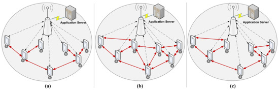 - Loosely coupled: In this model, illustrated in Figure 6a, a minimum number of links should be created and maintained within the D2D group using the one-to-one communication method.