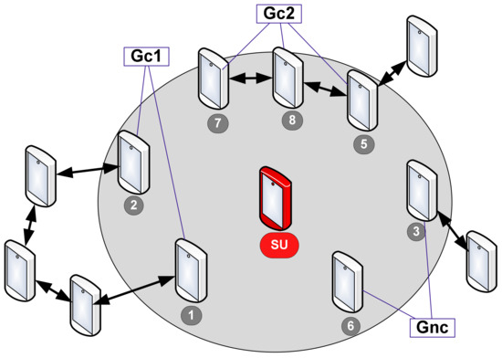 To facilitate the management of the network, each selected user (SU) will detect neighbors in his coverage and classify them according to two possible group types: The first single group, named Gnc (Group of not connected), which includes all the neighbors who have no path connecting them. The second group type is named Gc (Group of connected). Depending on the topology, some Gc groups can be created to include all the SU neighbors who already have a path that connects them. If many groups are created, they will be named Gc1, Gc2, Gc3, etc. We mention that the path that connects two neighbors can allow either a direct link or indirect link between them by crossing other UEs that are not necessarily neighbors of the SU. In the example illustrated in Figure 7, the SU should create the following groups: Gnc = {3, 6}, Gc1 = {1, 2}, and Gc2 = {5, 7, 8}.