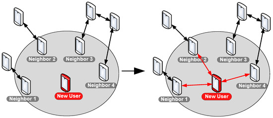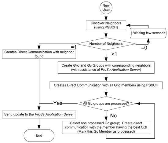 To join a D2D network, a new user (NU) starts by sending a PSCCH message to discover his neighborhood. Based on the PC1 interface, the ProSe Application Server should provide the NU with a global description of the participating UE including an identification of interconnection links. Based on this information, the NU should be able to create Gnc and Gc groups to classify discovered users in the neighborhood. As a next step, as illustrated in Figure 8 and Figure 9, the NU should create direct communication using PSSCH with all neighbors in the Gnc group. Afterward, direct communication should be established by the NU with the user having the best CQI in each Gc group.