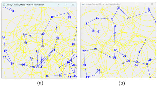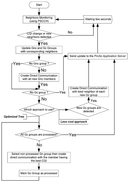 The geographic mobility of UEs, combined with different obstacles and external sources, can significantly affect the power and quality of the signal. In this context of a permanent change in CQI, it is important to conduct periodic updates to ensure the connectivity of the group. Two strategies are proposed: (1) The “Less cost” approach tends to retain the links between UEs as long as they exist. However, as soon as a link from a member of the Gc group is lost, a new link with a UE from the same Gc group will be created. (2) The “Optimized tree” approach is a little more expensive, but it has the advantage of guaranteeing a network with optimal links. As soon as a variation in the link with a member of one of the Gc groups is detected, the procedure is triggered to check if a better link is possible within the same group. The two approaches are illustrated in the flowchart in Figure 10.