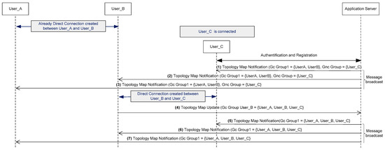 We found the server-based approach to be more robust since it allows newly connected users to receive existing topology maps in a direct and transparent manner. Also, the idea of keeping a single copy of the topology on the server side allows for better network management while avoiding overloading the bandwidth of the D2D links. As illustrated in Figure 11, when a new user joins the network, a Topology Map Notification Message is broadcast to all users (using messages 1, 2, and 3). If User_B and User_C are in range, a direct connection will be created (initiated by one of the two). In this case, the user who initiated the link establishment is responsible for sending the Topology Map Update Message to the Application Server (using message 4). A notification message will subsequently be broadcast to all participants including User_A, who will therefore be notified about the topology update. Thus, server notifications are sent during two scenarios: when a new UE connects or when a modification of the topology is reported by one of the UEs.